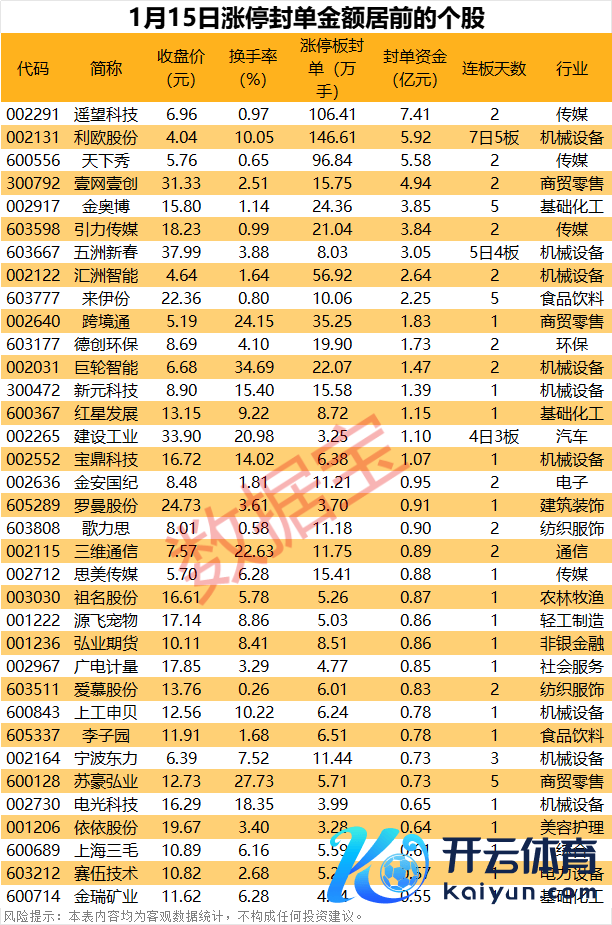 以封单金额诡计,16股封单金额超1亿元,遥看科技、利欧股份、天下秀封单金额居前,永诀为7.41亿元、5.92亿元、5.58亿元。