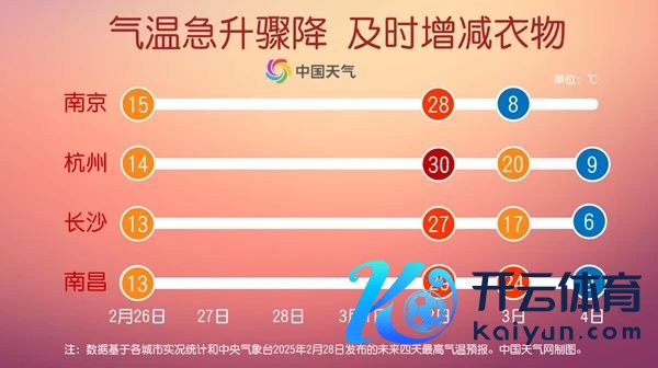 中国天气网教唆,昔时7天中东部多地将经验气温骤升骤降,容易诱发呼吸说念和心脑血管等疾病,公众请实时调理着装,作念好健康驻防。尤其南边地区在这个周末将经验片霎情切,下周寒潮降温近似雨雪来袭开云kaiyun,体感将会十分湿冷,厚穿戴别火暴收,需作念好春捂准备。